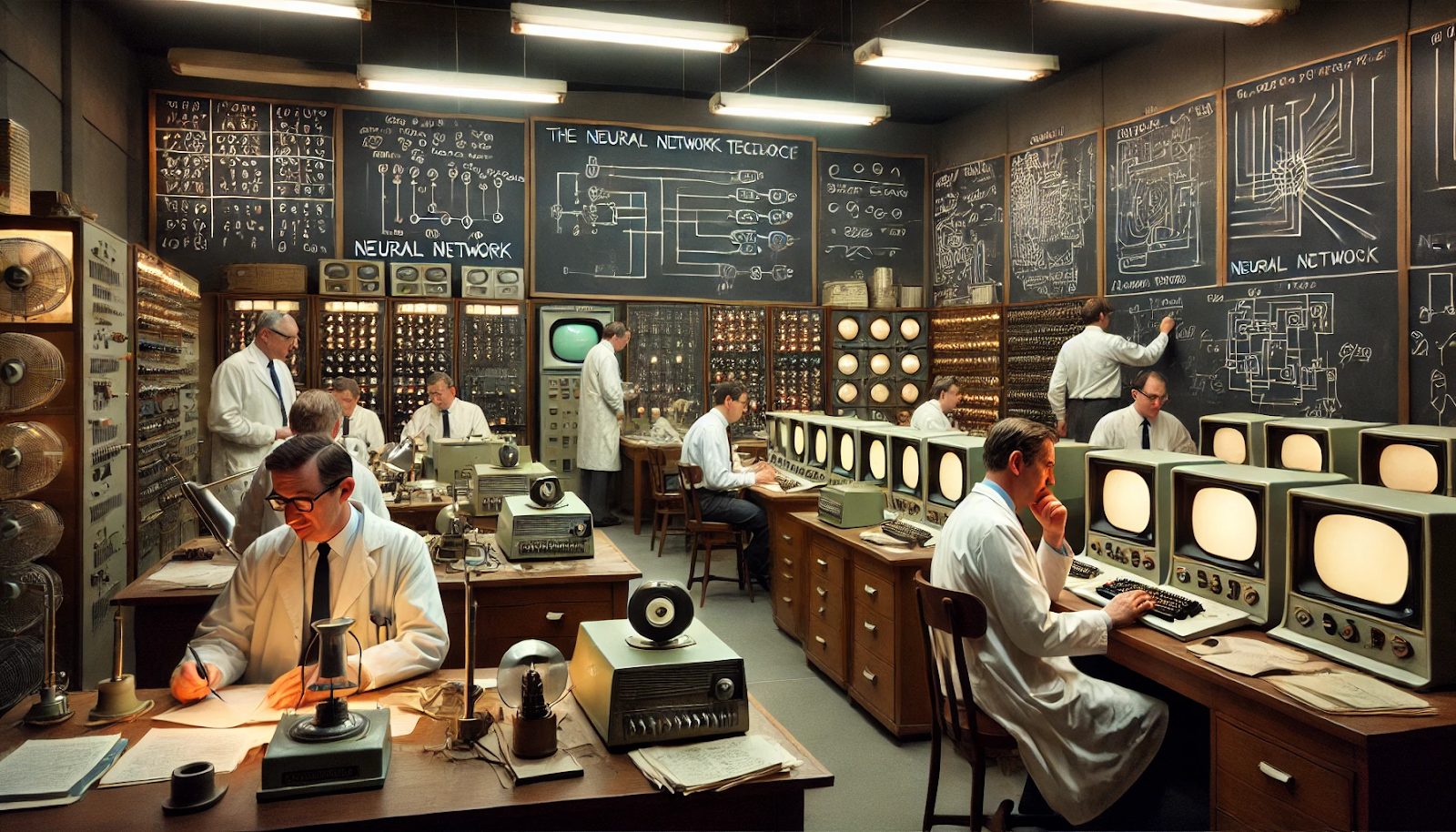 Изобретение выглядело как спаянные вручную куча проводов и блоков схем. Так Коуэн увидел и описал в своем дневнике первую модель аналоговой формой нейронной сети — предшественника ChatGPT с искусственным интеллектом.